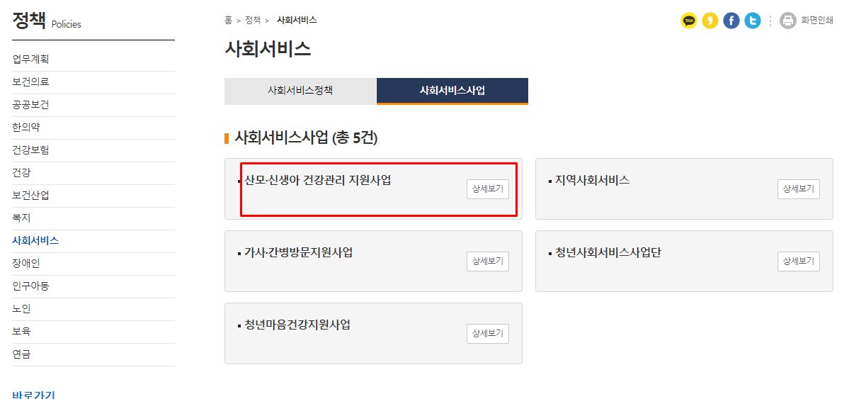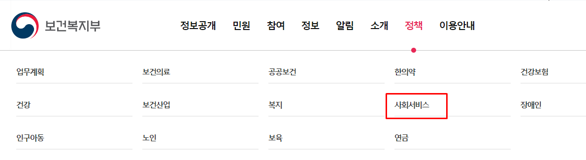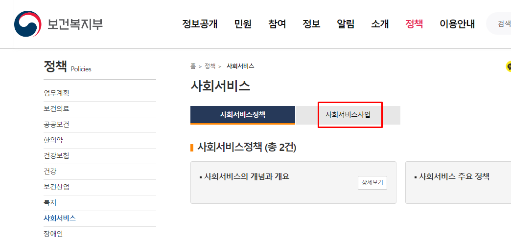 2. 정책 메뉴 사회 서비스 메뉴를 선택합니다.